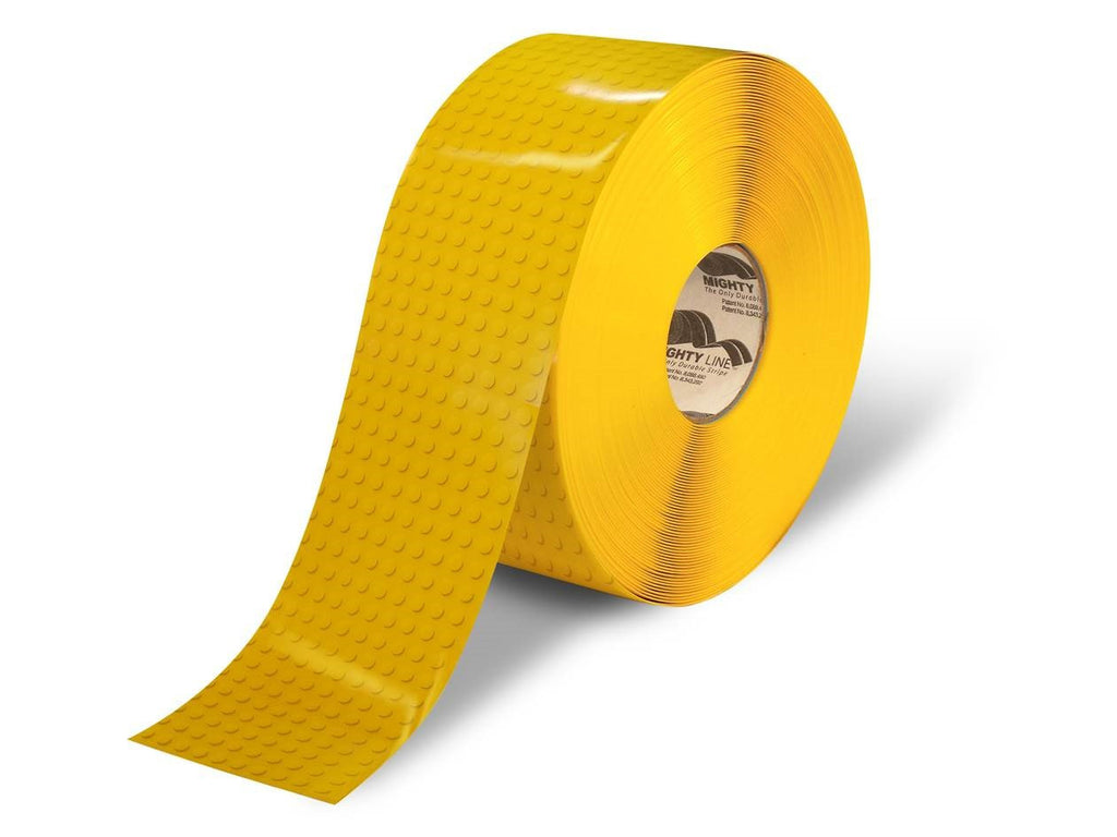 Patented Mighty Line Brick Safety Floor Tape. 100 foot industrial floor marking tape. Mighty Line floor tapes come with a 3 year limited warranty. Mighty Line peel and stick floor tapes have beveled edges which improves durability in harsh industrial environments. This floor tape is available in 2" and 4" widths and comes in Blue or Yellow color options.